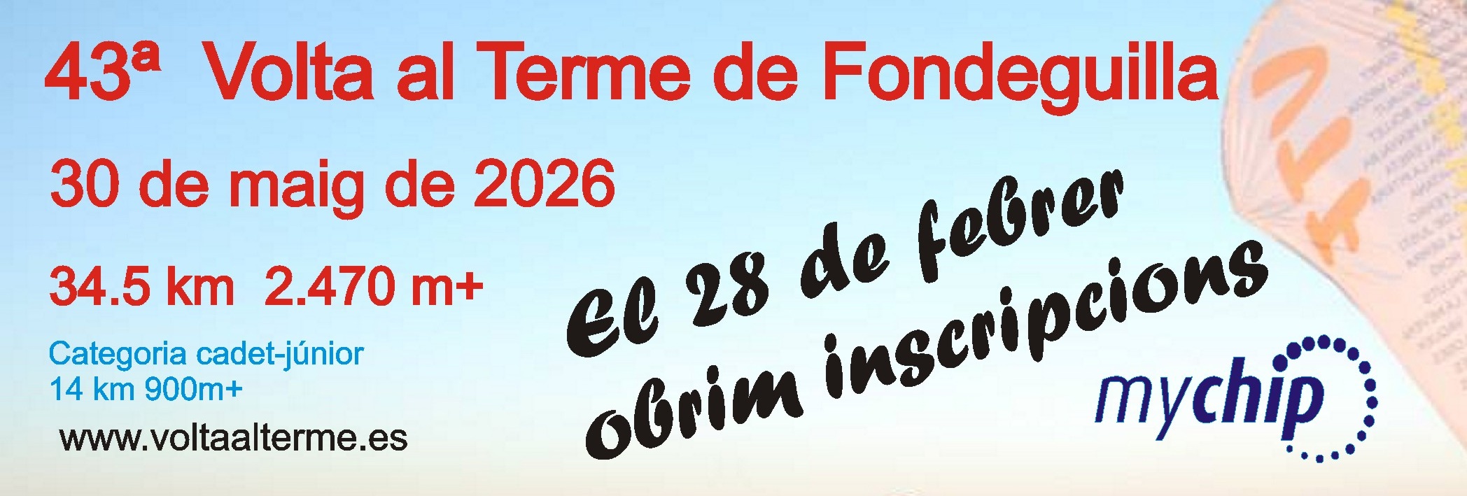 43Ŗ VOLTA AL TERME DE FONDEGUILLA HORARI i PROGRAMACIÓ 29 de maig de 2026 19:00 a 21:00 h. Lliurament de dorsals (Plaēa de l'ajuntament) 30 de maig de 2026 05:00 a 5:45 h. Lliurament de dorsals 05:45 Control de dorsals. 06:00 Eixida (Plaēa de lajuntament) 08:30 Eixida categoria cadet-junior des del Marianet 10:30 Tancament de control km 20,0 (Control Marianet) 12:00 Lliurament de trofeus (A la plaēa de l'ajuntament) 12:45 Tancament de control km. 28,8 (Control de Garrut) 14:00 Tancament de meta INSCRIPCIONS EN: CATEGORIES